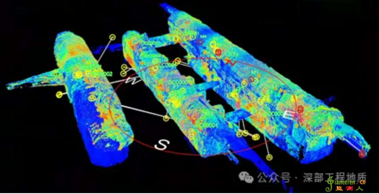 综合采用多点位移计、光纤、应力计、微震、激光扫描、无人机、钻孔TV、声波等多种监测手段,建立全时、全域三维立体监测体系,提出自动化、数字化、智能化感知识别方法,全面获取围岩变形、应力、破裂、损伤、结构面等多源监测信息。